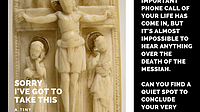 Decided to change the name of this tiny game-shaped thing 'cause it didn't amuse me anymore. It's entirely the same game, but now the name is SORRY I'VE GOT TO TAKE THIS. Nothing else changed. And the...